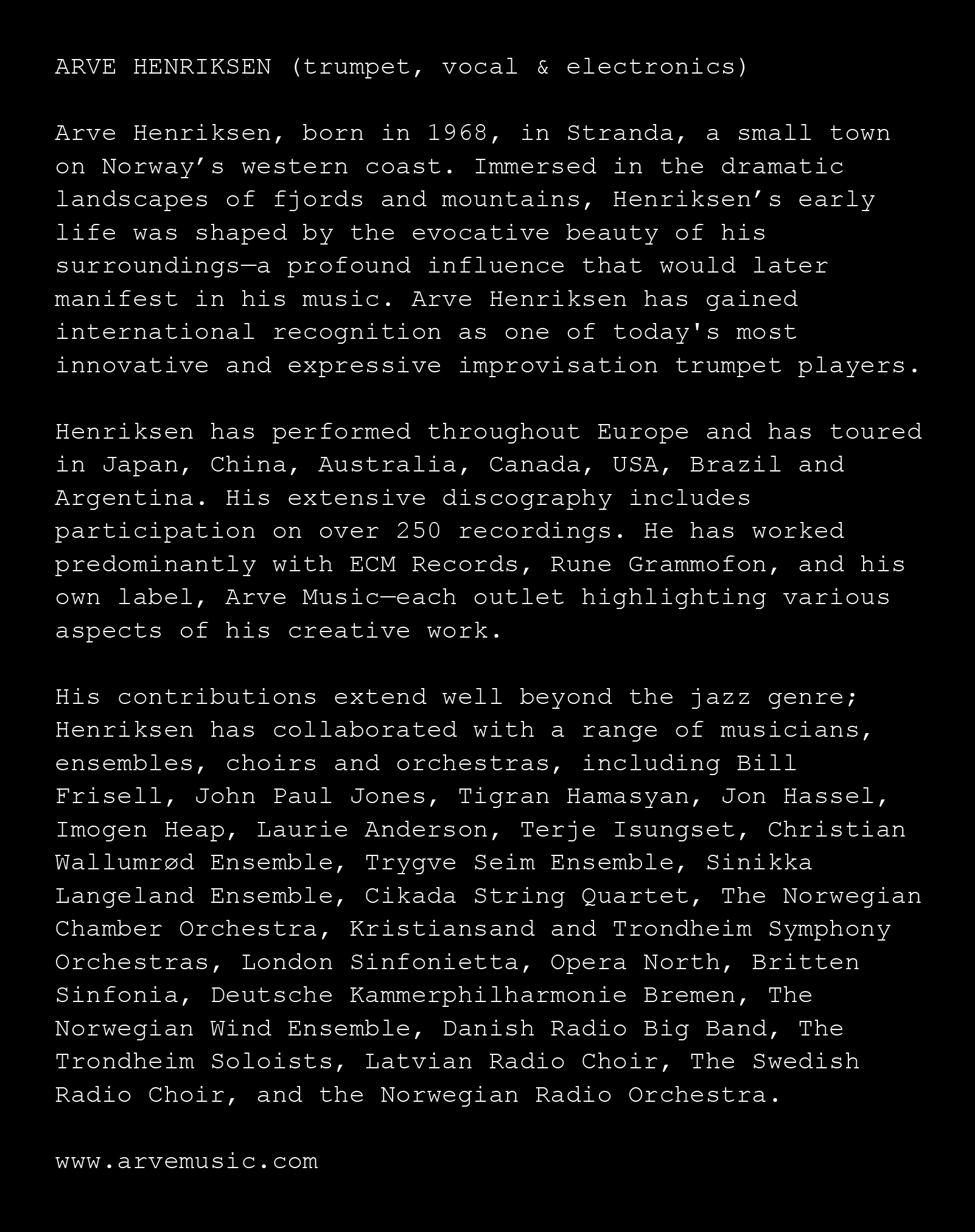 For Kroki Music Room – Part 2, we have invited Arve Henriksen to take us on a musical journey. Arve’s main instrument is the trumpet, but his musical repertoire is much broader than that.
